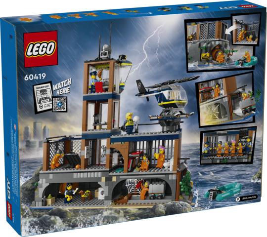 • What’s in this LEGO® building set? – A buildable prison island with a cliff face, prison, police boat, dinghy, helicopter, 3 officer and 4 prisoner minifigures, plus police dog and shark figures