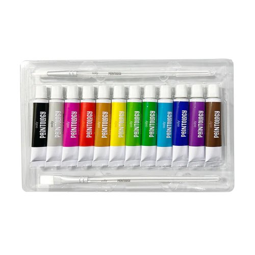 - Kit includes 12 acrylic colored paint tubes, 2 paint brushes (one thin and one broad)